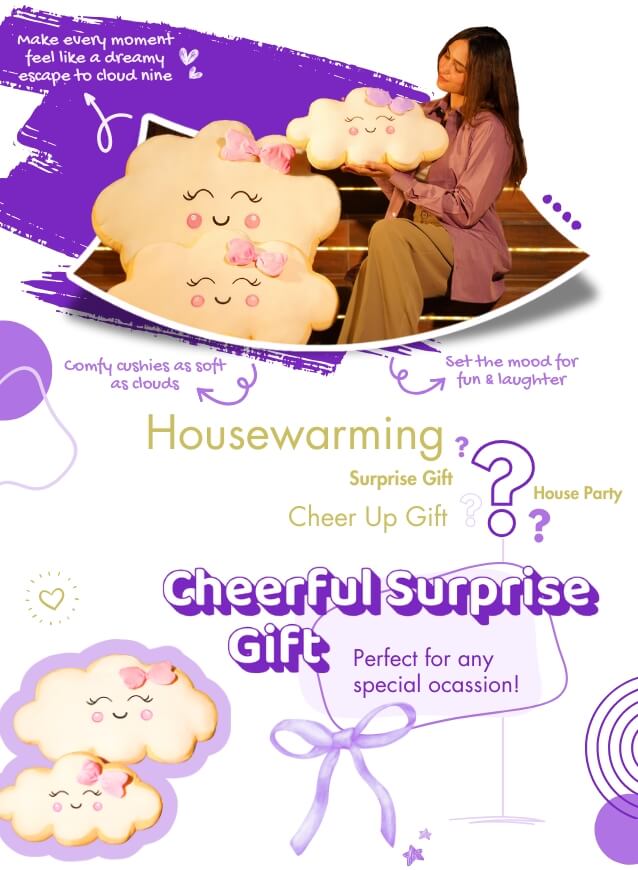 Our Cloud 9 Comfy Cushies feature an enchanting design that adds a touch of cuteness to any party setting. Their charming appearance makes them perfect room decoration items, enhancing the ambiance of your space and delighting your guests.